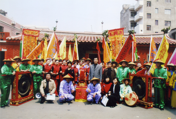 顏昌瑞與“嗦啰嗹”示范隊合影。受訪者 供圖 1976年,時任安海文化站站長的顏昌瑞召集老藝人,推出新組織的“嗦啰嗹”民俗表演隊,再次轟動安海。隨著當地經濟社會的快速發展,“嗦啰嗹”開始煥發蓬勃生機。 比如,面對如雨后春筍般涌現的商店和工廠,“采蓮”時所說的吉祥語也在不斷與時俱進——“龍王‘采蓮’采套房,主人生活日日紅”,這里的“套房”一詞,就是衍生的新詞匯。每到一地,“采蓮”隊伍說的吉祥話都不一樣,需要旗手和花婆提前做好準備。 “旗手、花婆、鋪兵這三個角色,是‘嗦啰嗹’的‘骨’和‘魂’?!鳖伈鹫f,近年來,“采蓮”隊伍也在不斷擴大,旗手、花婆這些主要角色由原來的一人增加至四人或六人,其他角色也相應增多。 此外,“嗦啰嗹”表演的“陣頭”也得到了擴充,不僅增加了“十音陣”“五音陣”“南音隊”“大鼓吹陣”和“爪哇鐘陣”等民間音樂,還有“涼傘舞”“踩球舞”“拍胸舞”“花姑陣”和“妝人陣”等民間舞蹈?!斑@些群眾喜聞樂見的‘陣頭’,增添了節日的喜慶氣氛,使整個隊伍顯得千姿百態,表演豐富多彩?!鳖伈鸨硎?。 一邊突破創新,一邊也有堅持?!颁伇毖g裝酒的夜壺較重且易碎,有的隊員想換成塑料的壺,這一提議,顏昌瑞堅決反對。他說:“這樣味道會變,我們要保留原汁原味?!睋私?,安海也曾出現過一些“變味”的“嗦啰嗹”表演隊,有的為了氣氛熱鬧,竟然加入北方音樂和東北民歌,甚至請來西洋樂隊演奏。在顏昌瑞看來,這都是不可取的。 心系安海民俗文化