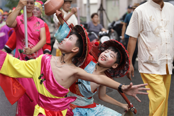 含有“嗦啰嗹”元素的春聯。東南網記者 林婕攝 端午節前,人們迎出木刻的“龍王頭”,舉行請神儀式,使龍神附體在“龍王頭”上,接受善男信女的膜拜。端午節當天,采蓮隊敲著大鑼大鼓,裝扮成鋪兵、家婆、旗手等角色,抬著“龍王”,沿途反復高唱《嗦啰嗹》曲,挨家挨戶為人們驅邪避災。 就像春節時的舞龍一樣,由于寓意美好,無論店家還是居民,端午節都會爭先恐后放鞭炮歡迎采蓮隊入內表演,爭采“頭蓮”“二蓮”“三蓮”。 顏昌瑞告訴記者,“嗦啰嗹”原本盛行于泉州各個鄉鎮,如今只剩安海鎮還在繼續著這項古老的民俗活動?!啊聠獑觥栽诎埠T?,得益于這里是一座歷史悠久的文化古鎮,更有像龍山寺這樣的名寺,眾多信徒長年從東南亞、臺灣等地區前來朝拜,文化交流廣泛?!?/p> 創新不忘原汁原味