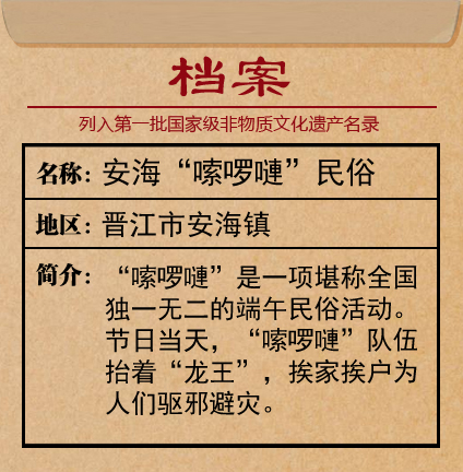 又到裹粽飄香時。往年,在晉江市安海鎮,居民們的端午節多是在“嗦啰嗹”的旋律中度過的。敲鑼打鼓、載歌載舞、游街串巷……這項堪稱全國獨一無二的端午民俗活動,總能將當地的節日氛圍推向高潮。 “國級瑰寶嗦啰嗹 鄉土珍貴民俗風”——23日,記者拜訪非物質文化遺產“嗦啰嗹”省級代表性傳承人顏昌瑞,還沒進門,就被門上含有“嗦啰嗹”元素的春聯所吸引。2008年6月,安?!班聠獑觥泵袼妆涣腥胧着鷩壹壏俏镔|文化遺產。正是依靠這位耄耋老人的堅持和努力,“嗦啰嗹”民俗才得以在安海古鎮傳承下來。 “采蓮”寓意驅邪避災