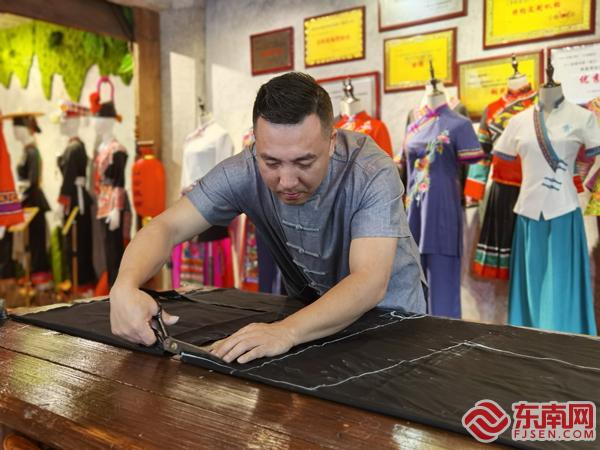 林章明裁剪布料。東南網記者葉伏國 攝 近日,記者來到閩東畬族傳統服飾制作技藝市級非遺代表性傳承人林章明的工作室時,他正在趕制一批工作裝,這批工作裝以傳統畬服為基礎,增添了相應的設計元素,經過反復修改后才達到最終效果。 畬族服飾是畬族文化的具體體現,它反映了畬族的民俗風情,也是畬族文化的重要組成部分。然而,隨著社會飛速發展,這個曾是畬族祖祖輩輩熟練掌握的技藝,在近代瀕臨消亡。 守藝26載 從手藝人到“守藝人”