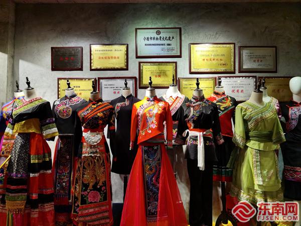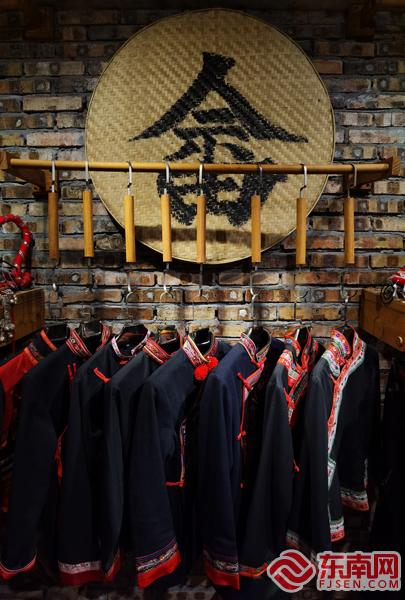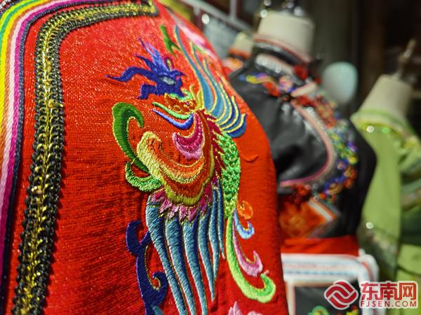 林章明整理工作室的畬服。東南網記者葉伏國 攝 林章明的優秀作品逐漸被挖掘。2012年,林章明設計的《飛龍在天》《火藍畬鳴》《鳳凰之歌》均入圍首屆中國畬族服飾設計大賽決賽,獲得單套常規實用型服裝優秀獎,使他成為福建省唯一入圍總決賽的設計師。 2019年,林章明的作品《鸞鳴》獲得第十屆福建省工藝美術精品大賽優秀獎;作品《畬山鳳》獲得第二屆中國(浙江)民族服飾設計展演匠心獎。 多年的堅守終于得到回應,畬族服飾受到了大眾關注,林章明對此深感欣慰。 “跨界”文創 畬服元素煥發生機