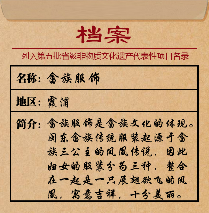 閩東畬族傳統服飾歷史悠久,據可查的歷史亦有200多年。清宣宗道光年間,霞浦縣溪南鎮白鷺坑畬族村民鐘應寶以精湛的技藝制作畬族服裝出名,經過家族代代傳承至鐘李發手中。