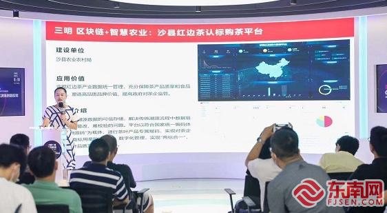 陳一彬展示區塊鏈的不同場景 東南網記者陳楠攝 記者在現場看到,共有熵鏈科技(福建)有限公司、銳達互動科技股份有限公司等6家企業帶來創新應用分享,包括區塊鏈應用開發引擎盤古?BDE、區塊鏈應用建創平臺夸父?BAB、IPFS 文件協同共享平臺、基于區塊鏈的綜合素質評價深化應用、建盞云、SOLAR 數據共享平臺等。 福建省區塊鏈協會秘書長陳一彬為大家分別展示了來自福州、廈門、泉州、南平、平潭、三明、龍巖等地15個不同場景的區塊鏈創新應用,包括沙縣紅邊茶認標購茶平臺、武夷山區塊鏈溯源平臺、“票鏈”區塊鏈電子發票平臺等。其中沙縣紅邊茶認標購茶平臺可幫助實現茶葉溯源數據的可信存儲,解決傳統溯源流程中數據易偽造、易篡改、難校驗的問題。平臺以符合國家統一編碼體系的“溯源碼”為載體,進行茶葉產品專屬賦碼,實現對茶企產量、商標用量的精細化、數字化管理,實現“兩標合一”,提升茶葉品質及品牌影響力。 |
