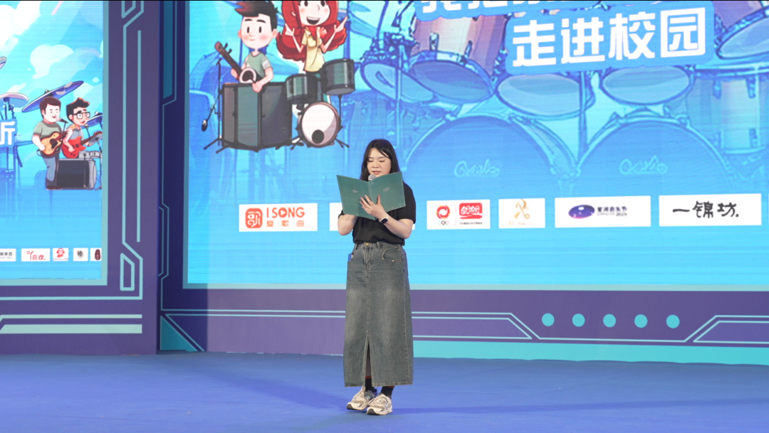 愛歌曲音樂平臺音樂總監林嘉欣女士致辭 活動現場,文藝演出節目層出不窮,全國各地音樂界老師也通過VCR表示自己的祝賀,原唱歌手林輝、何珺潔對活動主題曲“我把家鄉唱給你聽”深情演繹,隨后活動正式開啟。
