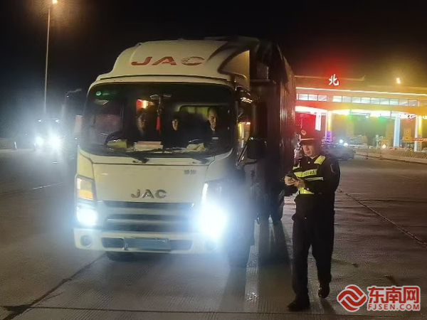 執法人員檢查證件。寧德高速執法支隊供圖 晝夜聯動,夜間突查超限運輸。3月10日晚,福安北中隊聯合轄區高速交警開展夜間治超專項行動,精準打擊貨運車輛違法超限運輸行為。執法人員采取 “定點布控 + 流動巡查” 的模式,在轄區收費站設置臨時檢查點,通過目測車輛外廓尺寸、核驗電子運單、檢查貨物固定情況等方式,對過往車輛進行嚴格篩查。