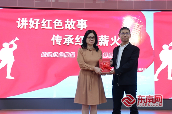泉州市委黨史方志室向學校贈送史志書籍。晉江市第二實驗小學 供圖 隨后,5位來自泉州紅色故事宣講團、晉江紅色故事宣講團的宣講員依次登場,他們以聲情并茂的講述,為聽眾們帶來了一場震撼人心的紅色故事盛宴。泉州市煙草專賣局團委書記、石獅市祥芝鎮湖西村駐村第一書記楊馨通過《家書里的華僑英烈》,展現中共泉州中心縣委首任書記李剛舍家衛國的英勇事跡;惠安縣山霞中心小學德育處主任蔣越冬講述《惠女精神 永遠的傳承》,帶領聽眾領略惠女堅韌不拔、無私奉獻的精神風貌;黎明職業大學教師蔡君雄的《用青春詮釋偉大的抗戰精神》,讓李子芳堅定信仰、寧死不屈的形象躍然眼前;英林鎮英埔中心小學教師柯遠峰分享《百兩黃金借還記》,一段共產黨人和宗教人士互信互助的佳話讓大家深刻體會到共產黨人廉潔奉公的優良作風;泉州市第二中心小學教師陳嘉瑜帶來的《烽火赤子 芳華無悔》,講述了南僑機工在中華民族危難關頭捐軀國難的感人故事。