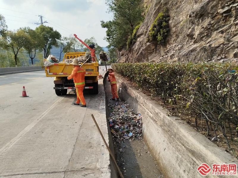 沙縣公路分中心班站職工正在清理水溝,確保排水系統暢通。