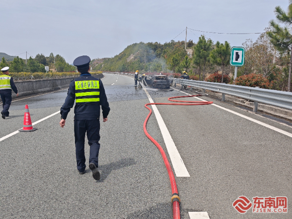事故現場。寧德高速執法支隊供圖 抵達現場后,執法人員和高速交警立即對事故現場進行交通管制,疏散周圍車輛和人員,防止次生事故的發生。消防隊員迅速展開滅火行動,利用專業消防設備對起火車輛進行撲救。經過緊張救援,明火最終被成功撲滅,所幸此次事故未造成人員傷亡。