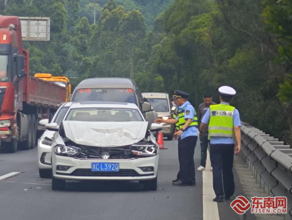 事故現場。寧德高速行政執法支隊供圖 事故發生后,大隊立即啟動聯勤預案,聯合高速交警、路勤中心趕赴現場。執法人員迅速在事故后方布設警示標志,通過擴音器引導后方車輛減速避讓,并協同交警對現場實施臨時交通管制,有效防止二次事故發生。經勘查,事故系車流密集路段車輛跟車距離不足所致,未造成人員傷亡。在多部門協同下,事故車輛被快速拖離至就近的福安下白石出口進行后續處理,10分鐘內路面通行秩序全面恢復。