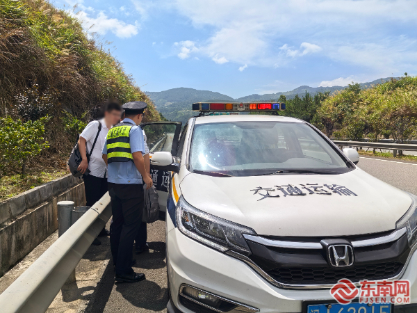救援現場。寧德高速執法支隊供圖 執法人員立即分頭行動:一組人員在來車方向150米外快速布設反光錐和警示牌,完成安全布控;另一組人員迅速將車內五名司乘人員引導至護欄外的安全區域。據了解,車上人員是從福州前往古田出差的,車輛行駛中右后輪突然爆胎,司機已撥打“12122”求助電話,正在等待救援。