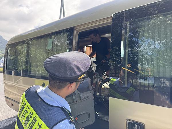 執法員與外國游客通過翻譯軟件交流 執法隊員向班車司機簡要說明了情況,司機表示理解并同意搭載該游客。在執法隊員的幫助下,法國游客順利登上了前往寧德的班車,為他后續前往福州爭取了寶貴時間。