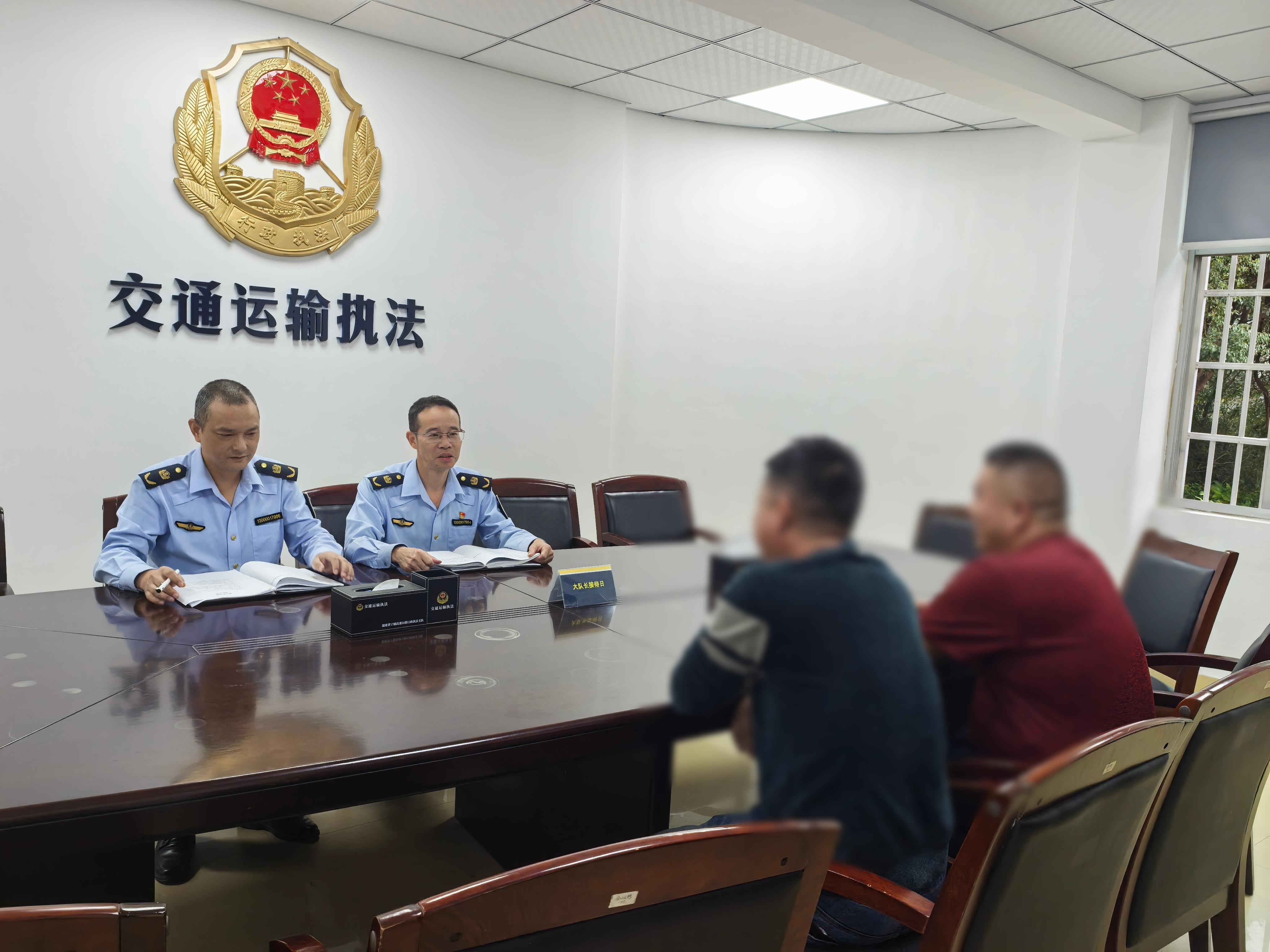 召開座談進行批評教育。寧德高速執法支隊供圖 與此同時,大隊部與寧德北中隊值班人員也趕至福安服務區布控,聯合引導車輛進入服務區接受檢查。經查,兩車雖持有《超限運輸車輛通行證》并配有護送車,但仍存在兩項違法行為:一是所載貨物實際尺寸與申報尺寸嚴重不符;二是未按審批線路行駛。執法人員隨即對兩起案件依法立案調查。