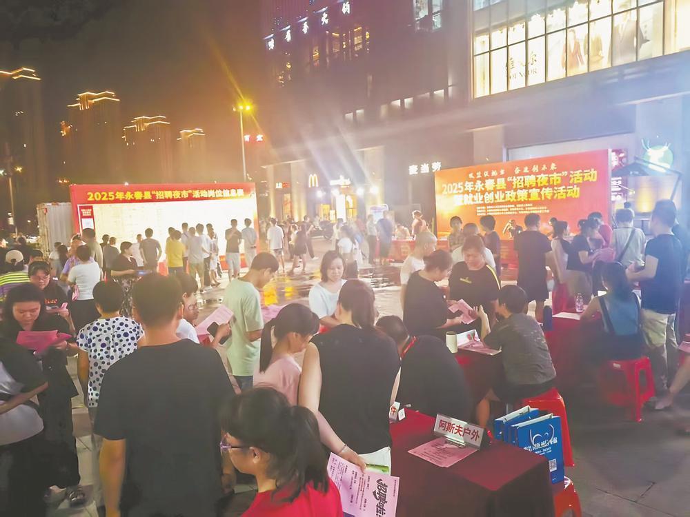 近日,2025年永春縣“招聘夜市”暨就業創業政策宣傳活動舉辦(如圖),共有26家企業參加,提供107個崗位,招聘需求人數1027人,吸引1500多名求職者到現場咨詢應聘,初步達成就業意向161人次。(8月5日 福建日報)