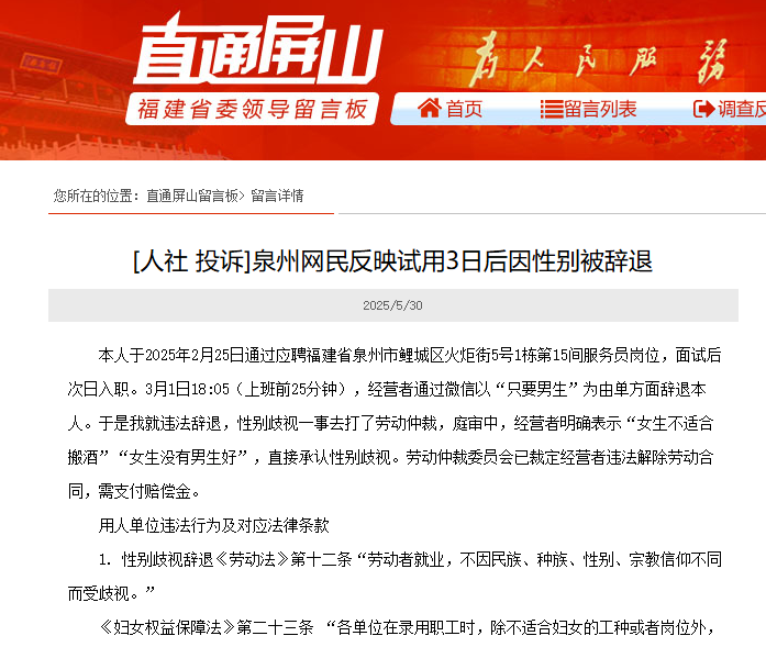東南網6月13日訊(本網記者 陳培源 林杰)今年初,泉州網友陳女士應聘泉州鯉城某酒吧服務員崗位,入職3日后,酒吧以“決定找男生”為由辭退她。經勞動仲裁,該酒吧被認定為“違法解除勞動關系”,需支付賠償金3500元以及三天的工資差額。因其時隔多日仍未履行裁決,近日,陳女士以受到性別歧視為由,向東南網《直通屏山》尋求幫助。【留言詳情】 員工:試用期因性別被辭退,不服! 經了解,今年2月25日,陳女士通過某招聘平臺獲取泉州鯉城某酒吧招聘信息,與酒吧經營者蘇女士電話及微信溝通后,當晚經蘇女士面試并通過。雙方約定試用期工資為3500元/月,全勤獎200元,無加班費,工作時間為18:30至次日2:30。次日,陳女士開始到該酒吧工作,未簽訂勞動合同,也未繳納社保。 陳女士入職3日后,蘇女士通過微信告訴她:“你晚上不用去了。經過決定還是找男生,因為這個瑣事太多了,怕女孩子熬不住?!卑凑彰嬖嚂r雙方約定的“若未通過試用按兼職1天100元支付工資”,蘇女士向陳女士轉賬300元。 陳女士不服蘇女士的辭退理由,于4月21日向泉州市鯉城區勞動人事爭議仲裁委員會申請勞動仲裁,要求酒吧支付違法解除勞動合同的賠償金3500元及三天試用期的工資差額103.84元。泉州市鯉城區勞動人事爭議仲裁委員會受理后,于5月16日組成仲裁庭公開開庭審理。5月27日,泉州市鯉城區勞動人事爭議仲裁委員會出具裁決書,支持陳女士的仲裁請求。 老板:用人3天判賠一月工資,冤枉! 6月10日,東南網記者向該酒吧經營者蘇女士了解了情況。蘇女士表示,在陳女士入職前兩天她也招聘了一名男員工。相比之下,這名男員工比陳女士工作積極性更高,眼里更有活,更勤快。經過權衡對比,蘇女士決定留下男員工。辭退陳女士時的理由只是委婉的說法,不存在性別歧視?!懊嬖嚂r對試用期、試用工資都說得很清楚,我也按照面試時的約定支付了工資,不明白為什么還要告我違反勞動法,感覺很冤枉!”蘇女士說。 不過,陳女士認為,這些都是蘇女士的狡辯說辭。陳女士說:“面試時是說招前臺,但上班的時候給我派了很多活,前臺、后廚、傳菜、清潔,什么活都要干?!? 蘇女士也向記者展示了2月25日兩人的微信聊天記錄,陳女士詢問工作具體內容,蘇女士回答:“工作內容很簡單,比如說客人進來(接待一下),然后對團購的酒核銷、上酒??腿俗吡?,把桌子收拾一下。中途,客人需要加酒的話,就給他們上上去?!? 針對仲裁結果,蘇女士表示無奈?!白鳛橛萌藛挝?,我們也不確定她能否被錄用,所以肯定不會第一天進去就簽合同,畢竟是服務行業。既然仲裁下來了,我也沒辦法,判我給一個月工資,我也得給?!碧K女士表示,將盡快支付。目前陳女士仍未收到相關賠付。 律師:不能合理解釋辭退理由,違法! 北京盈科(泉州)律師事務所高級合伙人肖歷美律師表示,用人單位應當遵循《中華人民共和國勞動法》《中華人民共和國勞動合同法》等法律法規的規定,勞動關系存續期間,用人單位不得違法解除勞動合同,否則應按法律規定承擔支付補償金、賠償金、補足工資差額等法律責任。如果蘇女士認為陳女士在試用期間不符合錄用條件,可以要求解除勞動合同。但她以“瑣事太多、怕女孩子熬不住”為辭退理由,這個理由不符合法律規定。而且,蘇女士在面試期間并未明確約定錄用條件和崗位要求,雙方亦未簽訂書面勞動合同進行約定,蘇女士不能合理解釋陳女士為何不符合工作要求,直接辭退陳女士,則屬于違法解除勞動合同。 肖歷美律師表示,用人單位招聘、用工都應當嚴格遵守法律法規規定,并應當重視用工前的招聘程序,發布招聘公告時,需清楚寫明崗位名稱和要求、錄用條件、工資標準、上班時間等內容。員工入職時,也應當及時與員工簽訂書面勞動合同,明確約定工作時間、工作內容、工資發放標準、試用期限、考核要求等事項。法律法規明確規定了解除勞動合同的不同事由和相應責任,用人單位也應當充分了解,合法合規用工。 肖歷美律師提示,本案已經勞動仲裁委員會裁決,如果用人單位未按裁決履行,陳女士有權向人民法院申請強制執行。 |