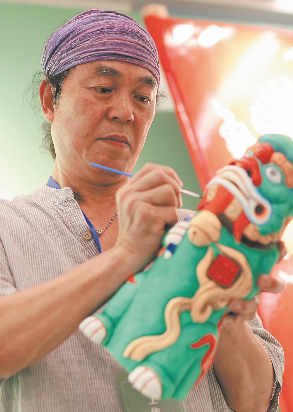 金門藝術家王明宗現場給風獅爺上色。陳建和 攝