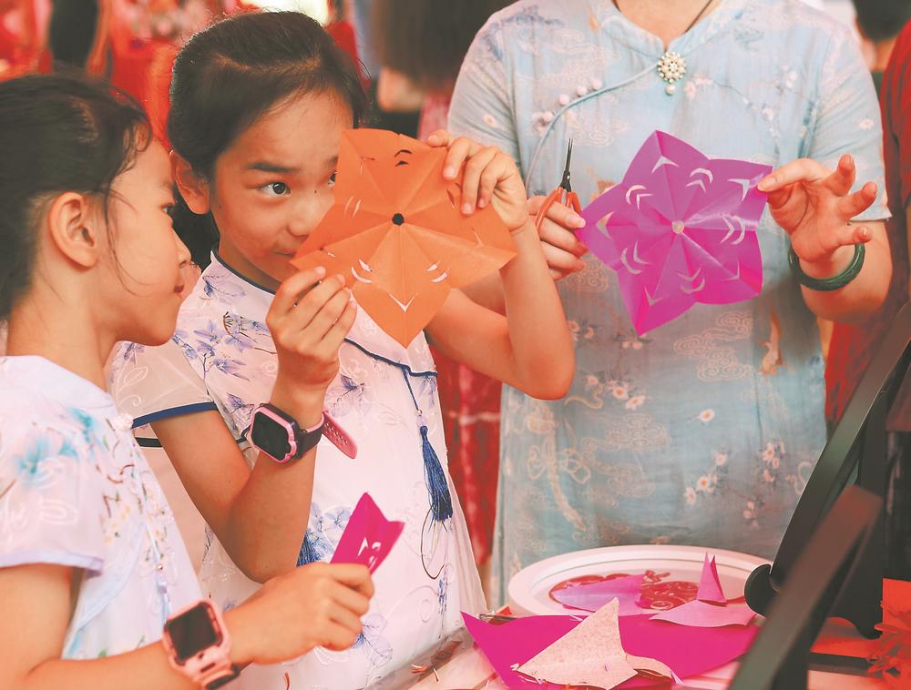 孩子們現場體驗剪紙樂趣。陳建和 攝 |