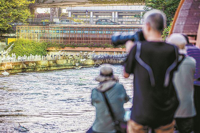 觀鳥愛好者在筼筜湖邊拍攝鳥類。