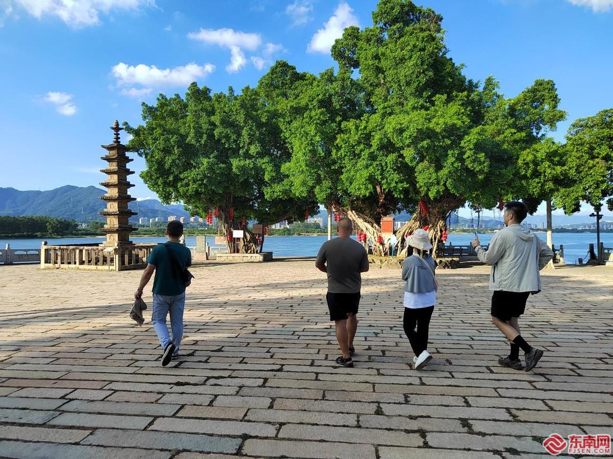 村內的螺女廟和鎮國寶塔臨江而矗,同樣是侯官村的標志性建筑。主播們在螺女廟聽侯官村黨委委員王國鋒講述“田螺姑娘”經典民間傳說,在巨榕下打卡舊時為鎮水患依江而建的鎮國寶塔。