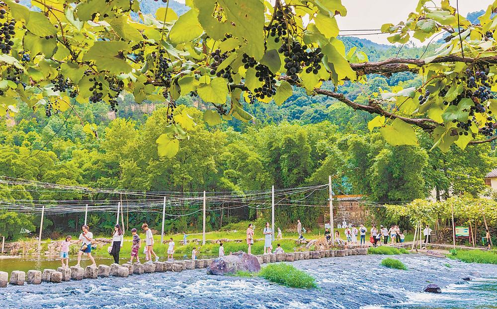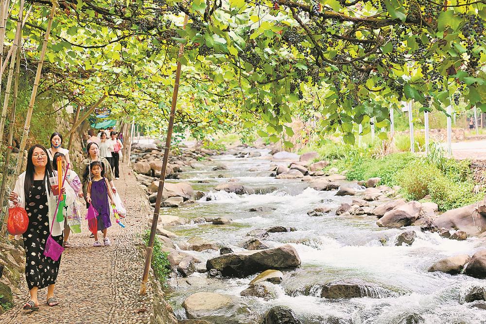 游客在溪水邊的刺葡萄藤下漫步。 東南網8月29日訊(福建日報報記者 單志強 通訊員 李郁 陳雅芳 攝影報道)藤上葡萄滿架,藤下溪水潺潺。初秋,位于福安市穆云畬族鄉溪塔村的“中國最美葡萄溝”內,綿延6公里的刺葡萄進入采摘季。作為福安本地“土著”品種葡萄,刺葡萄于上世紀六七十年代在溪塔村的秀溪兩岸溝澗中被大面積種植。目前,該村刺葡萄種植面積已達1200多畝,形成了年產值約1200萬元的地域特色果業。 每至初秋刺葡萄豐收,溪塔村都會吸引許多游客前來采摘,這里自然風光和畬鄉文化的美名也不脛而走。近年來,穆云畬族鄉加大旅游基礎配套設施投入,建設下坪魚鱗壩、沿溪夜景燈光、畬家酒坊、畬族文化館等,進一步吸引游客前來體驗畬鄉慢生活,刺葡萄等特色農產品的銷路也更加通暢。 |