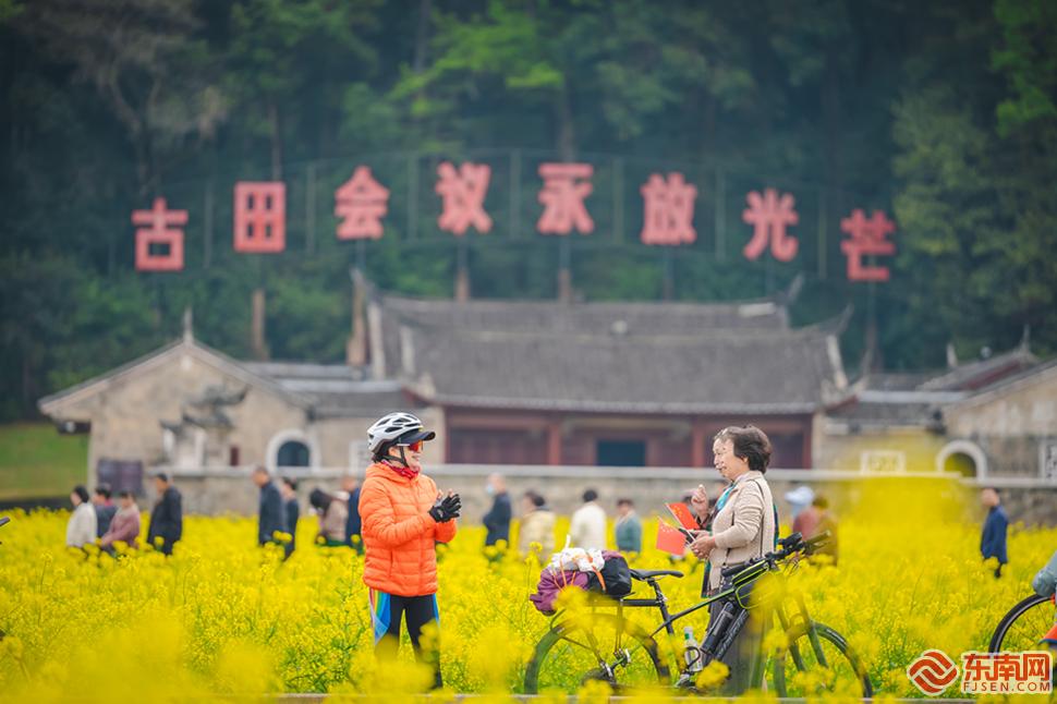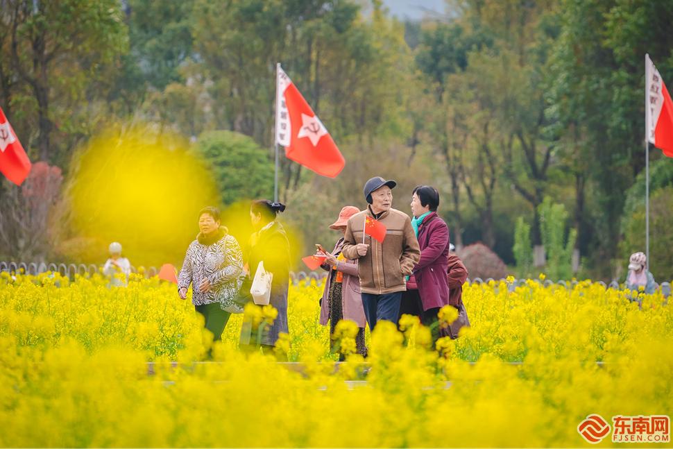 龍巖市上杭縣古田會議會址百畝油菜花 張銳暢攝 東南網龍巖3月17日訊(本網記者 馬伊驊 通訊員 張銳暢 袁宏珍 張沛與 謝思棋 李亞鵬 何龍祥)“這里風景很好,油菜花一望無際,空氣清新,游客也很多。帶孫女來玩,感覺很不錯?!苯?,龍巖市上杭縣古田鎮千畝油菜花迎春盛放,大片金黃花海吸引一眾游客前來觀賞,看著花海,游客張根妹很是開心。