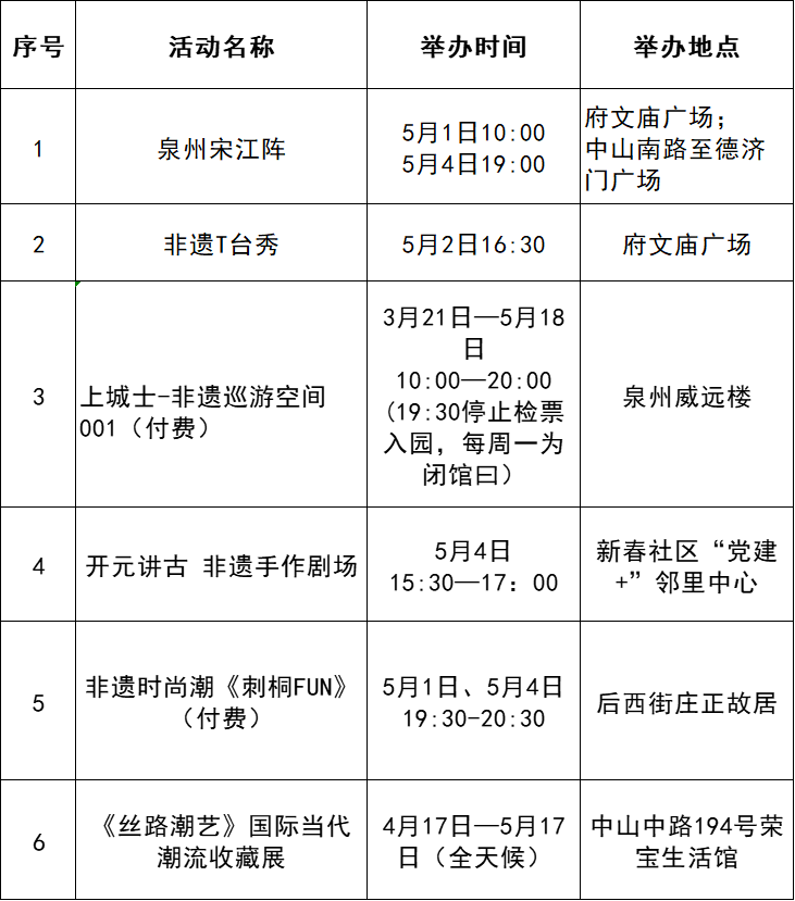 非遺展演精彩不停 非遺芳華閃耀古城 節日期間,各類非遺展演將在古城大街小巷輪番上演,讓市民游客在歡聲笑語中領略泉州深厚的文化底蘊。其中,泉州宋江陣結合《水滸傳》中108將人物形象,演繹青獅陣、宋江陣傳統民間特色藝陣、武術以及高甲戲打斗雜耍等,重現泉州“棍棒手撲,妙絕天下”的民俗風采;非遺T臺秀將非遺元素與現代時尚設計巧妙融合,展現非遺獨特魅力。