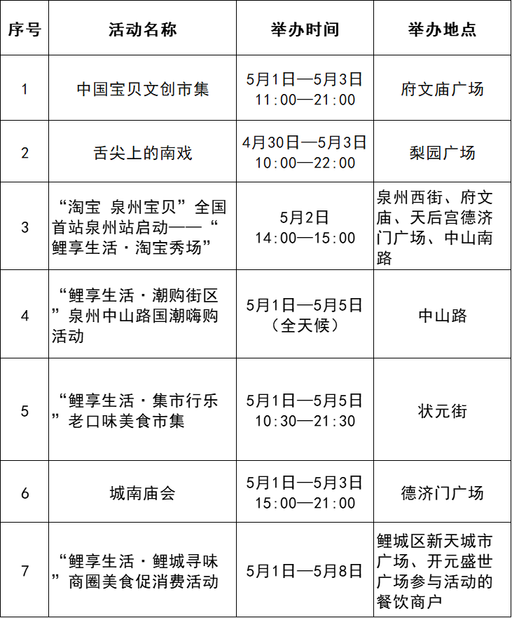 各類市集火熱開市 樂購一觸即發 中國寶貝文創市集借助淘寶平臺,吸引全國20家手工藝人創新創作,聚焦泉州戲曲、非遺等文化元素,打造聯名款創意市集,開展非遺產品展示和教學互動。舌尖上的南戲將結合全國南戲展演開展泉州美食體驗?!磅幭砩睢ぬ詫毿銏觥庇商詫毤槲锾孕殠ьI8個IP人偶,沿泉州影劇院廣場—中山中路—打錫街—府文廟西南門等路線巡游,沿途直播推介鴻星爾克、安踏、匹克、名創優品等國潮品牌。 “鯉享生活·集市行樂”老口味美食市集一站式打卡“舌尖上的泉州”,活動期間還有公益義診、閩南武術表演、掌中木偶路演、戲曲路演、現代樂隊演出、特色美食、劃拳比賽等。城南廟會打造“匠心傳承·勞動筑夢”主題廟會雙節聯動的文化盛宴,通過“非遺活化展演+情景交互體驗+美食文創市集消費”三位一體模式,聚商氣促消費。