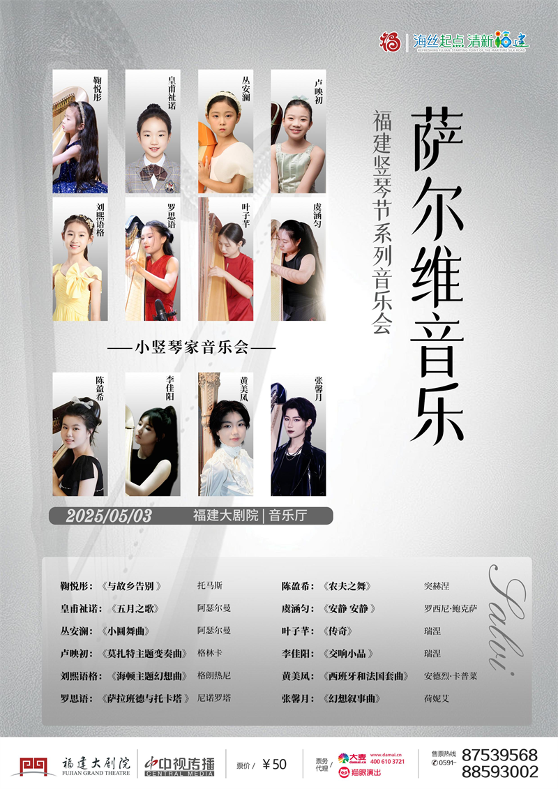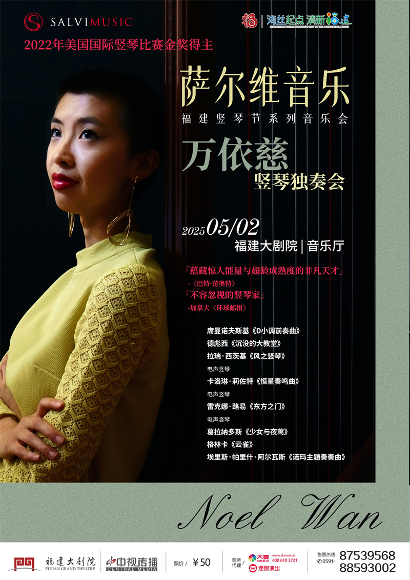 名稱:薩爾維音樂福建豎琴節——豎琴獨奏音樂會 時間:5月1日-3日 20:00 地點:福建大劇院音樂廳 主辦單位:薩爾維音樂、福建大劇院、福建藝術職業教育學會豎琴專業委員會