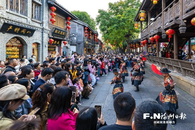 節日里的福州,文旅熱度更盛。國慶中秋假期,三坊七巷的人潮中,身著古典服飾、頭戴“三條簪”的游客成了流動風景?!盎瘖y師邊做造型邊講‘三條簪’的由來,我也融入了城市的歷史里?!眮碜詮V東的“90后”游客劉舒舒說。數據印證這份火爆:國慶中秋假期前七天,三坊七巷客流量達126.48萬人次,同比增長11.28%。
