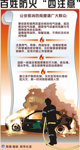 百姓防火“四注意” 新華社發 ——要嚴格按照有關法律法規和技術標準的規定,安裝和使用質量合格的電氣設備,規范敷設電氣線路,確保電氣設備和線路與可燃物保持安全距離;謹慎使用加熱、取暖設施,不用時及時關閉電源。 ——注意用氣、用煤、用油安全,定期檢查閥門和管道的密封情況,及時維修或更換破損器件,住宅內禁止存放燃油。 ——選配一些適合家庭需要的滅火器、救生繩、強光手電、逃生面具等自防自救器材,及時撲救初起火災,安全逃離火災現場。 ——建立多戶聯防機制,加強對未成年人、老年人和病殘人員等群體的安全監護,開展防火檢查尤其是夜間防火巡查,及時發現和撲救初起火災,第一時間救助被困人員。 延伸閱讀:廈門:電氣火災成“禍首”占總數的54% (張景勇,崔清新) ? |