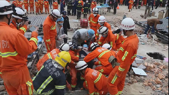 安撫鼓勵獲救人員 由于被困男性胸部被卡,救援難度較大,救援人員一邊對其安撫和輸氧,一邊同步破拆壓在其胸口的水泥板,10多分鐘后將其成功救出?!爸x謝你們給了我們一家重生的機會”!事后了解到他們為一家四口,指戰員科學、及時救援讓他們一家化險為夷。此時離救援工作展開不到2個小時,已有6名被困人員成功得救。 連續奮戰——4小時救出 15人 為進一步提高救援效率和救援進度,指揮部通過詢問被救人員,并結合搜救犬、生命探測儀搜索情況,基本明確了剩余被困人員的位置,并按區域劃分出救援網格,采取人歇裝備不歇,分批輪流作戰的方法。