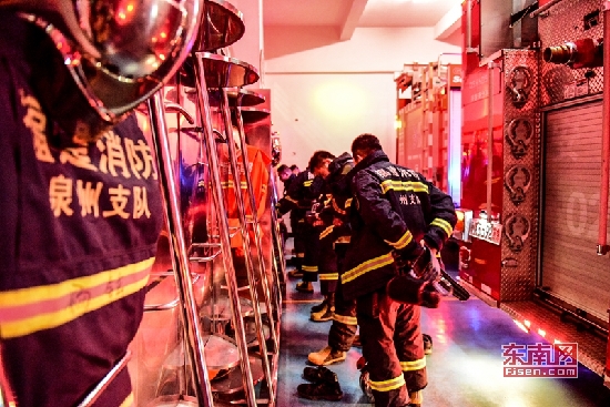 緊湊的警鈴聲響起,隊員們要在最短的時間內穿好戰斗服出發。東南網記者 林婕 攝