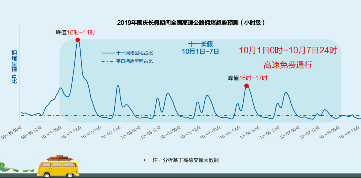 《報告》顯示,十一國慶高速返程高峰出現在10月5日和6日,預計分別是10月5日15時-19時,峰值出現在16時-17時;10月6日15時-19時,峰值出現在16時-17時;其中返程出行最高峰值出現在10月5日16時-17時。