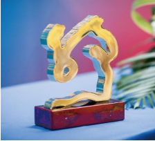 以電影的菲林與影盤為基本設計元素,由菲林盤繞而成的皇冠頭飾,明亮晶瑩的眼神,開心的表情,配以活潑動感、跨步前進的肢體動態,傳遞出親切、可愛的視覺形象,還寓意“絲綢之路國際電影節”的發展與輝煌。 整體形象色彩以“海洋藍”為主色調,“榕樹綠”為輔助色調,形與色渾然一體,充分體現福州的海洋文化及作為海上絲綢之路重要港口的歷史淵源,具有舉辦地福州的城市形象和地域人文特色。 ·電影節獎杯: