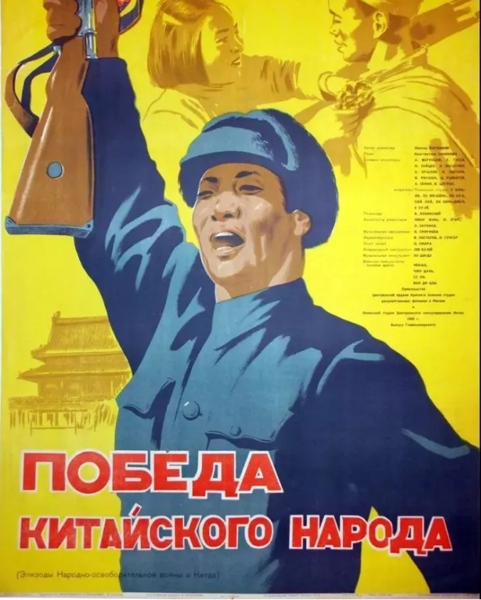 ▲俄文版《中國人民的勝利》海報 沉睡了半個多世紀后,阿列克謝·杰尼索夫從浩如煙海的膠片中發現了它們,并決意讓當年付出無數汗水甚至鮮血才拍到的彩色鏡頭及其承載的中國人物“重放光輝”。