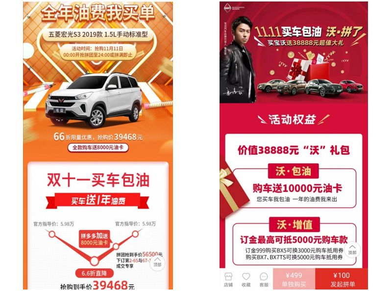 △“你買車,我包油”,拼多多首創“買車包油”,回饋消費者。 一位參與此次活動的汽車商家表示,拼多多“萬人團”等創新玩法,不僅能精準發掘和識別潛在消費需求,也極大降低了從供應鏈到渠道運營的整體成本,“我們很樂意一起拿出前所未有的促銷力度回饋消費者”。拼多多汽車業務總監繡春表示,這次的車型都是基于大數據分析精選,“我們創造性地直接給消費者補貼一年油錢,希望把為4.83億用戶創造更多實惠和樂趣的新消費理念,貫穿到底?!?/p> 全網首推買車包油,“百億補貼”幫老司機省到爆 在補貼上從無套路的拼多多,這次在整車銷售上繼續“動真格的”。 消費者只要在11月11日0點至24點支付999元定金,并于規定時間到店支付其余車款,即可兌換8000元至10000元加油卡,享受“買車包油”的優惠?!拔覀冏屑殰y算,普通家庭一年所需油費大約在8000元到10000元之間,這筆‘包油’補貼正好是一年的油費”,繡春說。 “拼多多會在整車業務持續扛起‘普惠’大旗”,繡春介紹,今年上半年,拼多多提出了“百億補貼”戰略,聯合眾多品牌商共同為消費者提供100億消費補貼,確保覆蓋商品的售價均為全渠道的歷史最低價。由于覆蓋范圍全面、優惠力度空前,“百億補貼”深受消費者喜愛,現已升級成為平臺的一項長期戰略。本次“買車包油”,拼多多將“百億補貼”引入了整車銷售行業。 據了解,本次活動由拼多多聯合多家車企共同發起,平臺共向消費者推出五菱宏光S3 2019款1.5L手動標準型國VI、2019款名爵ZS 1.5L手動65寸巨幕天窗“拼多多版”、寶沃BX5、BX7、BX7 TS全系列、觀致5S 1.6TGDI SUV汽車國VI、長安CS75 17款尚酷版1.5T自動旗艦型等多款車型。 其中,五菱宏光S3的官方指導價為59800元,第1與第66位成功支付訂金者,還可享受全網最低的搶購活動一口價39468元(相當于66折,不享受8000元油卡補貼)。雙11當天,五菱宏光的配置庫存為500輛,名爵為800輛,寶沃BX5、BX7、BX7TS共1000輛,觀致5S、長安CS75均為200輛。