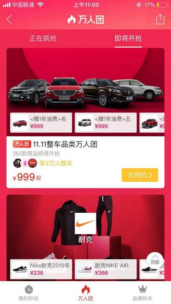 △通過“萬人團”匯聚同類需求,集中體現了拼多多“人以群分”的邏輯。截至11月10日11點,預約人數已超20000人。 繡春表示,拼多多的使命之一,就是給消費者帶來更多高質平價的商品,推動城鄉消費公平?!拔辶夂旯狻笔窃谙鲁潦袌鍪姓悸蕵O高的“國民神車”,名爵、寶沃、觀致、長安等車型是縱貫各線城市的高性價比標配用車。此次與多款車型合作,是希望用不同品牌“穿透”城鄉之間的隔閡,期待它能給更多中國城鄉家庭帶去一份便利、溫暖和希望,“我們將盡全力滿足廣大城鄉愛車族‘全網低價買品質好車’的需求?!?/p> 截至11月10日11點,5款“買車包油”車型的“預約想買”人數已超20000人。 |