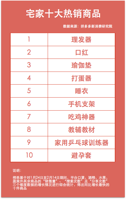 拼多多發布“宅家十大熱銷商品”:理發剪、打蛋器、避孕用具上榜