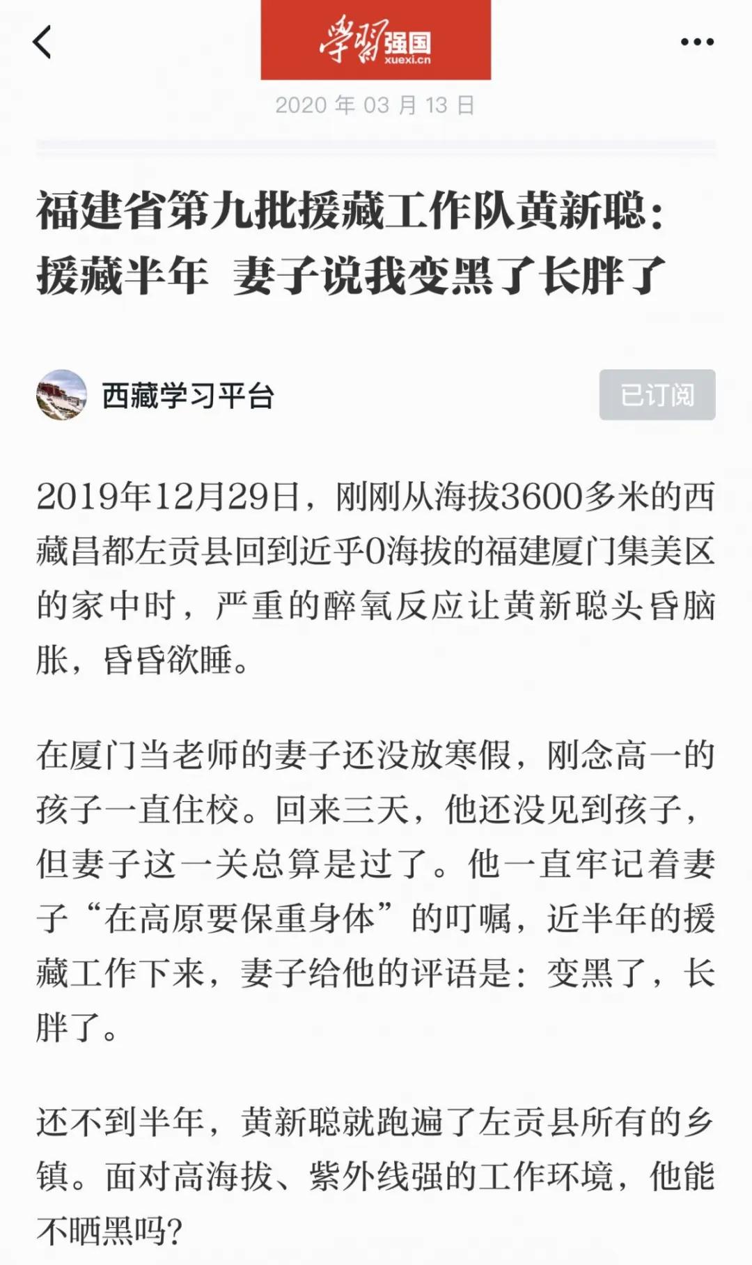 編者按:3月13日,“學習強國”平臺報道閩九援隊員《福建省第九批援藏工作隊黃新聰:援藏半年 妻子說我變黑了長胖了》。