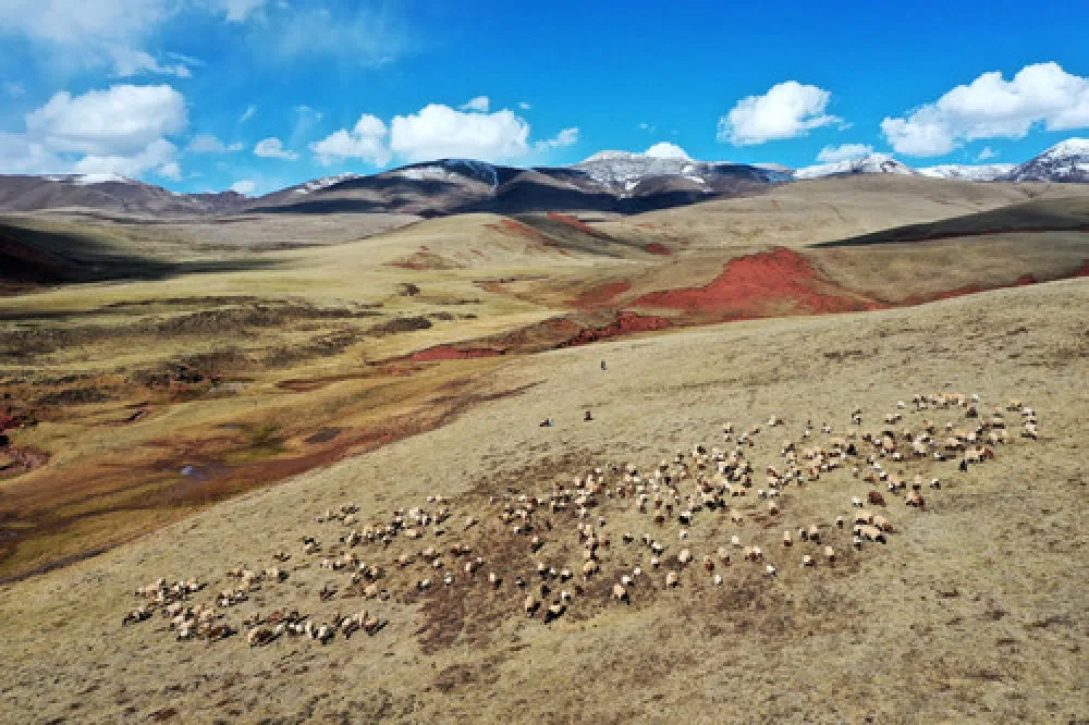 立夏時節,位于西藏昌都市貢覺縣的阿旺鄉牧場已是綠油油一片,遠處是高聳的雪山,熾熱的陽光曬得人臉上發燙。1400多只綿羊散布在山坡上,啃食著鮮美的青草,悠然自在,就像草原上的朵朵白云。