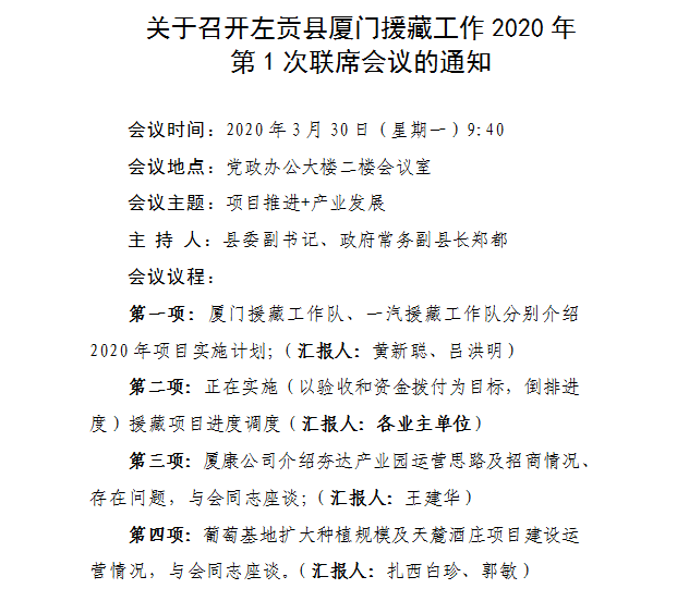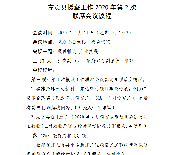 2020年5月11日,左貢縣召開左貢縣2020年第2次援藏工作聯席會議上,各相關業主單位就本年度第1次援藏工作聯席會議既定事項落實情況及近期援藏項目進行了匯報;閩九援左貢工作組、中國一汽援藏隊通報了近期援藏工作動態,與會人員共同討論了十四五援藏規劃重點內容以及如何進一步規范援藏項目資金使用流程等。