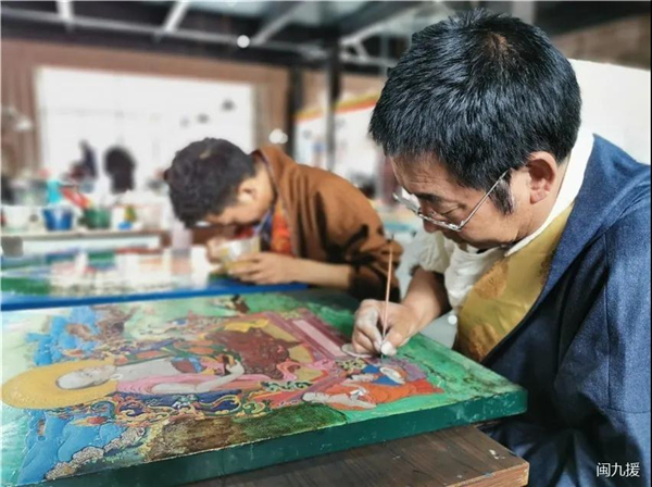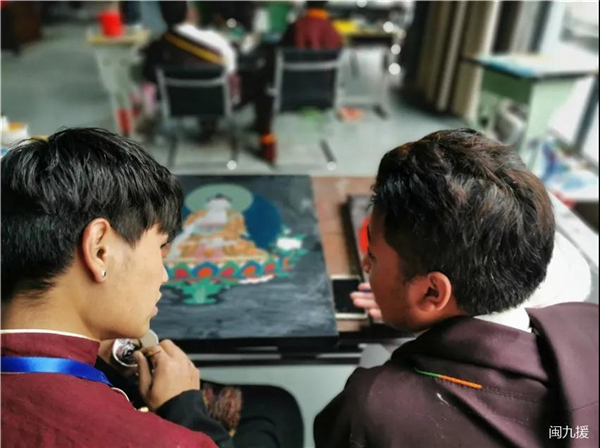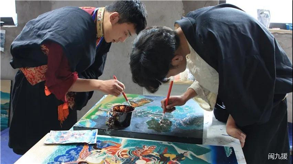 本次直播活動由福建省文化和旅游廳指導,福建省藝術館(福建省非物質文化遺產保護中心)、昌都市文化局(市文物局)、福建省第九批援藏工作隊主辦,昌都市新區管委會協辦,海峽教育報承辦。 2019年,福建省第九批援藏工作隊會同福建省文旅廳、福建省藝術館和昌都市文化局聯合組建了“唐卡漆畫文化產業小組團”,選取昌都市唐卡藝術傳承人和唐卡畫師為重點培訓對象,教授運用漆畫技藝制作唐卡作品。今年5月,昌都市首屆唐卡漆畫技藝培訓班在西藏昌都開班,37名學員經過40天培訓,將創作一批以昌都解放70周年為主題的唐卡漆畫作品,為昌都解放70周年獻禮。 培訓班既是福建藝術扶貧工程打造的農民漆畫創新實踐的升級版,也是福建省第九批援藏工作隊按照中組部精準實施“小組團”援藏工作的要求,采取“短小精?!钡慕M團方式,找準切入點,解決問題,填補行業空白創新的“福建經驗”和“福建模式”