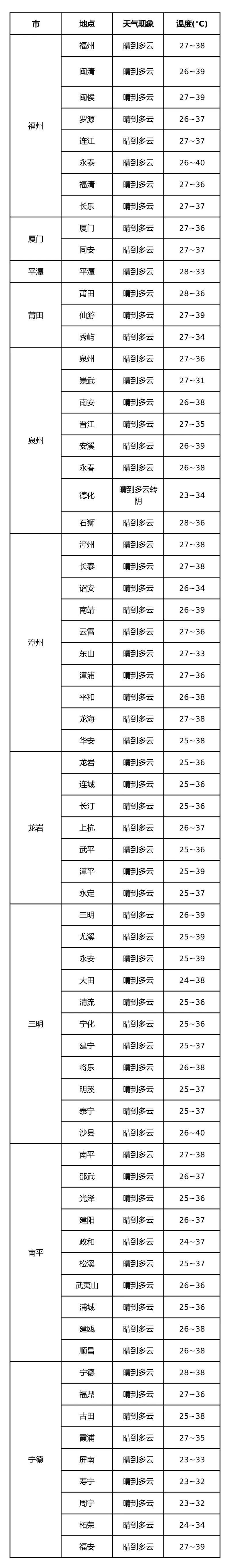 18~20日,全省晴到多云,午后局部有陣雨或雷陣雨。我省大部地區最高氣溫可達35℃以上,其中南平大部、三明大部、福州大部、漳州大部、寧德東部、泉州中部、龍巖東部、莆田西部的城區可達37~39℃,三明、福州兩市的局部城區可達40℃。 18日各地天氣具體如下: