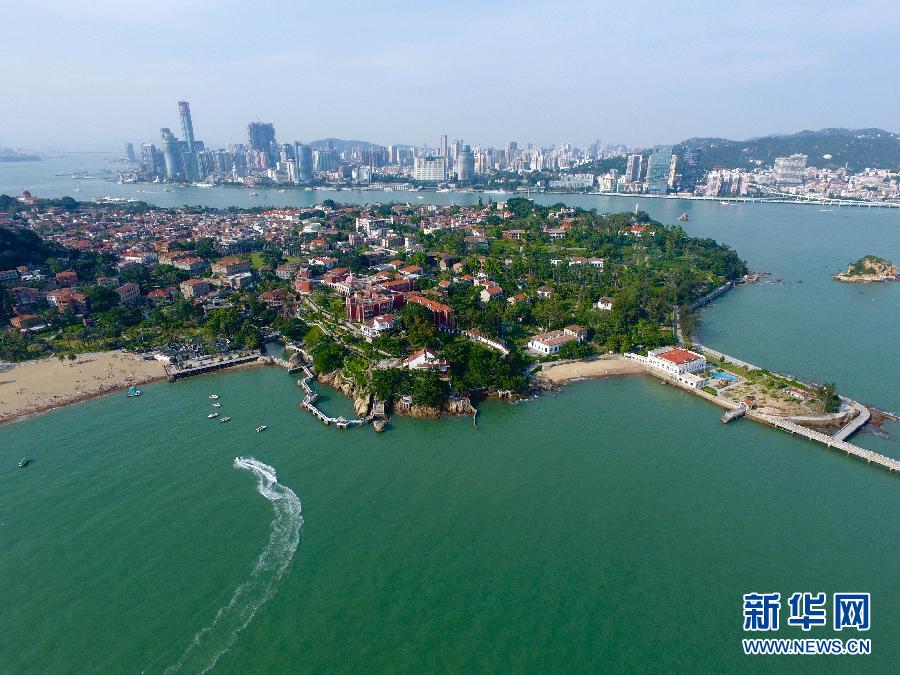 空中俯瞰,鼓浪嶼歷史風貌建筑與鷺江海峽對岸的現代建筑遙相輝映。新華社記者姜克紅攝