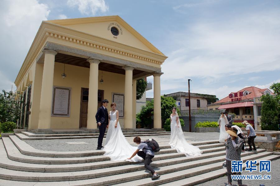 鼓浪嶼代表性歷史建筑協和禮拜堂前幾對情侶在拍攝婚紗照。新華社記者姜克紅攝