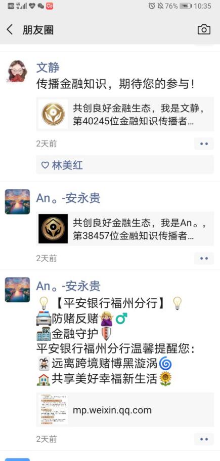 (2)組織開展金融知識宣傳月線上接力:通過微信朋友圈參與“我是金融知識傳播者”接力活動,鼓勵員工發動客戶、親朋好友參與接力活動。