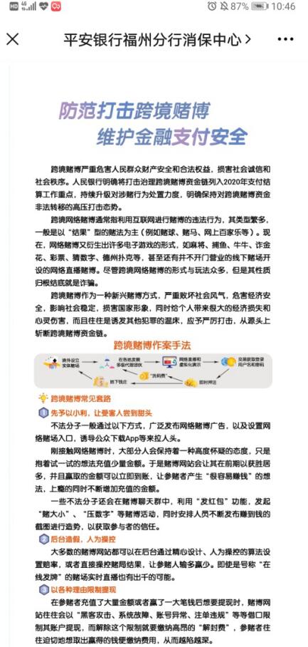 2020年“金融知識普及月 金融知識進萬家 爭做理性投資者 爭做金融好網民”已經在榕城拉開序幕。平安銀行福州分行在過去的一周都有什么精彩表現呢?讓我們一起來回顧一下吧! 在過去的一周,平安銀行福州分行的各支行網點伙伴們以廳堂為主要陣營,通過線上、線下模式組織開展形式各樣豐富多樣的金融知識宣傳活動,尤其是針對進網點辦理業務的老年人群體、青少年群體以及低凈值人群等特殊人群做重點宣教普及工作。 一、網點線上宣傳 (1)分行微信公眾號推送消保金融知識:分行通過分行消保公眾號制作 “防賭反賭”軟文,并組織下轄支行通過微信朋友圈分享轉發839次。