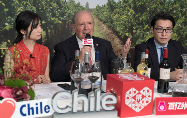 ▲智利駐華大使路易斯·施密特先生(中)與拼多多副總裁陳秋(右)一起做客“百億補貼”官方直播間,帶領消費者體驗“舌尖上的智利”。(穆功 攝)