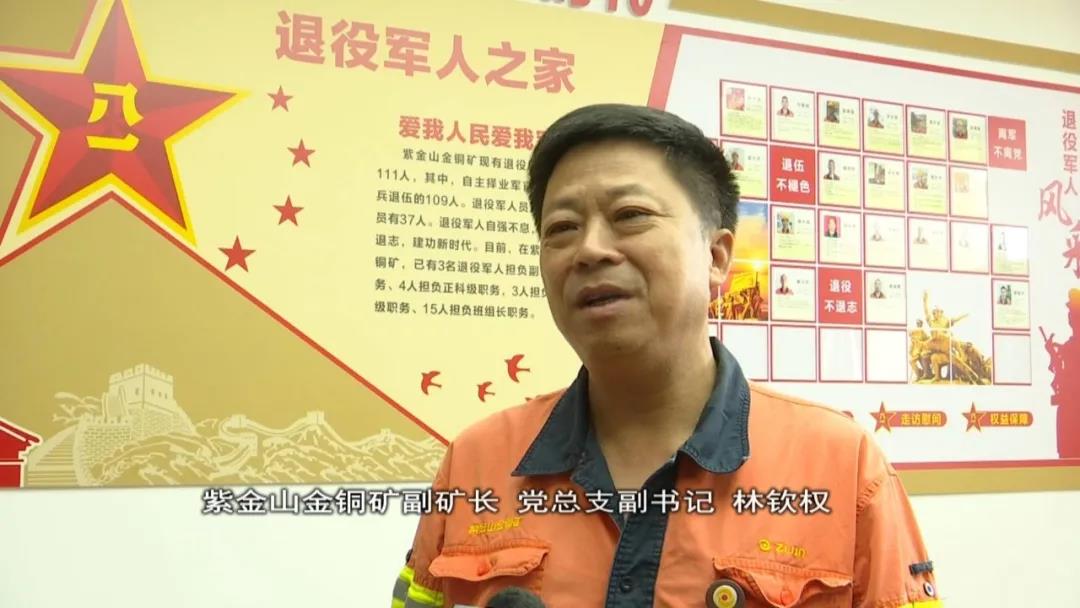 林欽權 紫金山金銅礦副礦長 黨總支副書記 這些退伍軍人在我們整個紫金山金銅礦的生產、安全各方面發揮了非常重要的作用。我們還專門成立了應急救援隊伍,都是以退伍軍人為主,我們的礦山救護隊也是以退伍軍人為主,他們在紫金山金銅礦應急救援的方方面面起到了非常重要的作用。 為持續推動單位擁軍文化建設,今年8月份,紫金山金銅礦還成立了全縣首家企業“退役軍人之家”,主動給予退役軍人就業扶持,關注困難退役軍人的家庭情況和生活狀況,及時幫助他們解決生活和工作中遇到的問題,讓退役軍人們實實在在地感受到企業的關懷與溫暖。