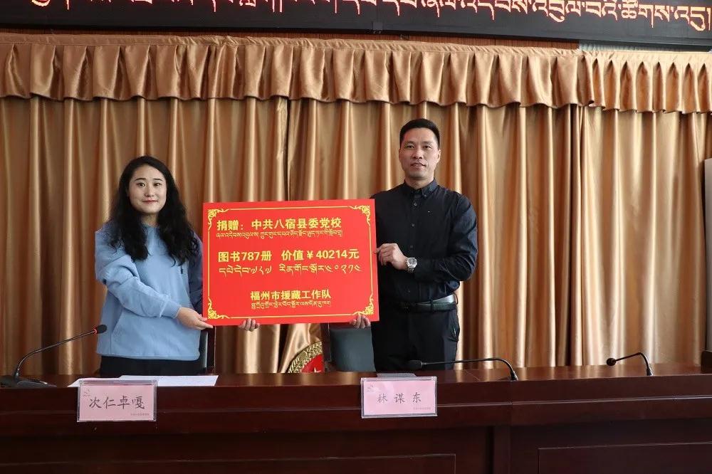 會上,林謀東同志代表福州市援藏工作隊向八宿縣委黨校捐贈價值40214元的787冊圖書,內容涵蓋基層黨建、經濟管理、心理學和社科等方面,將最大限度滿足八宿縣廣大黨員干部的讀書需求。