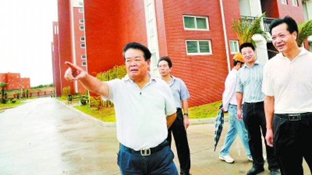 曹德旺(左一)到他捐助的中學了解校舍建設情況。福建日報記者 游慶輝 攝